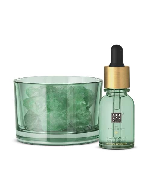- Difuzorul cu piatră minerală pentru noapte: un accesoriu elegant pentru noptieră, este disponibil într-un recipient de sticlă rafinat, însoțit de un flacon de 20 ml cu parfum. Intensitatea aromei poate fi ajustată în funcție de numărul de picături adăugate. Este conceput pentru a susține relaxarea și un somn odihnitor. Amestecul liniștitor de lavandă și lemn de santal umple delicat încăperea, contribuind la calmarea minții și pregătirea pentru somn.