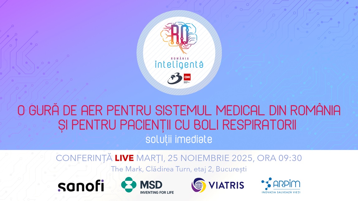 Conferința națională România Inteligentă ”O gură de aer pentru sistemul medical din România și pentru pacienții cu boli respiratorii – Soluții imediate”, va avea loc marți, 25 noiembrie 2025, începând cu ora 09:30, la Centrul de Conferințe Antena 3 CNN, “The Mark”, Clădirea Turn, Calea Griviței nr. 84-98, etaj 2, sector 1, București și va fi moderată de Mihaela Tănase, expert în comunicare politici de sănătate, și Adrian Ursu, jurnalist Antena 3 CNN.