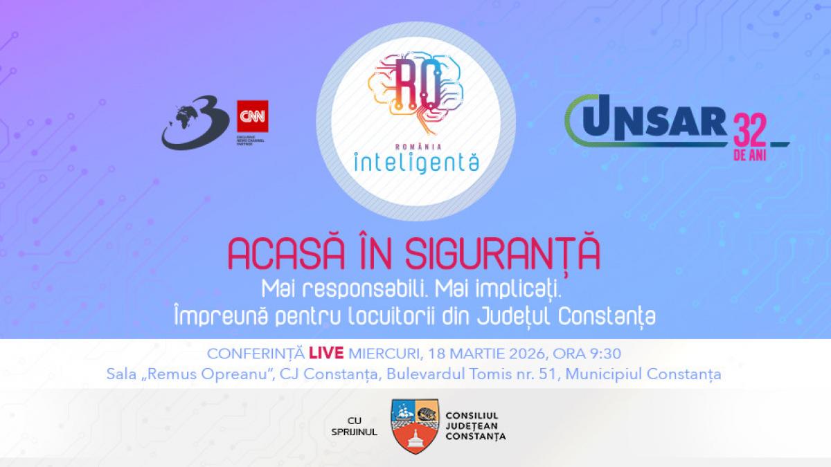 Conferința România Inteligentă ”Acasă în siguranță. Mai responsabili. Mai implicați. Împreună pentru locuitorii din Județul Constanța” va avea loc miercuri, 18 martie 2026, ora 9:30, în sala „Remus Opreanu” din cadrul Consiliului Județean Constanța, Bulevardul Tomis nr. 51, municipiul Constanța și va fi moderată de Adrian Ursu, jurnalist la Antena 3 CNN.