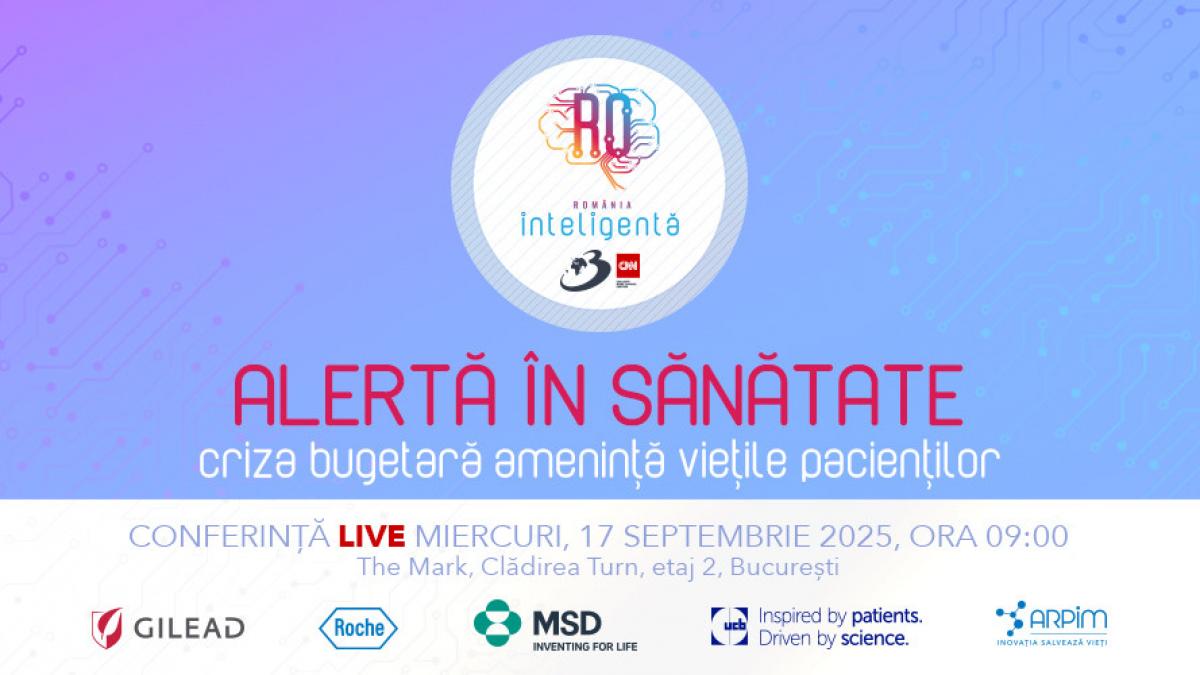 București, 17 septembrie 2025 – În contextul unei crize financiare profunde care afectează grav sistemul de sănătate din România, Antena 3 SA organizează Conferința Națională România Inteligentă cu tema „Alertă în sănătate – criza bugetară amenință viețile pacienților”, miercuri, 17 septembrie 2025, începând cu ora 9:30, la Centrul de Conferințe „The Mark”, Clădirea Turn, Calea Griviței nr. 84-98, etaj 2, sector 1, București.