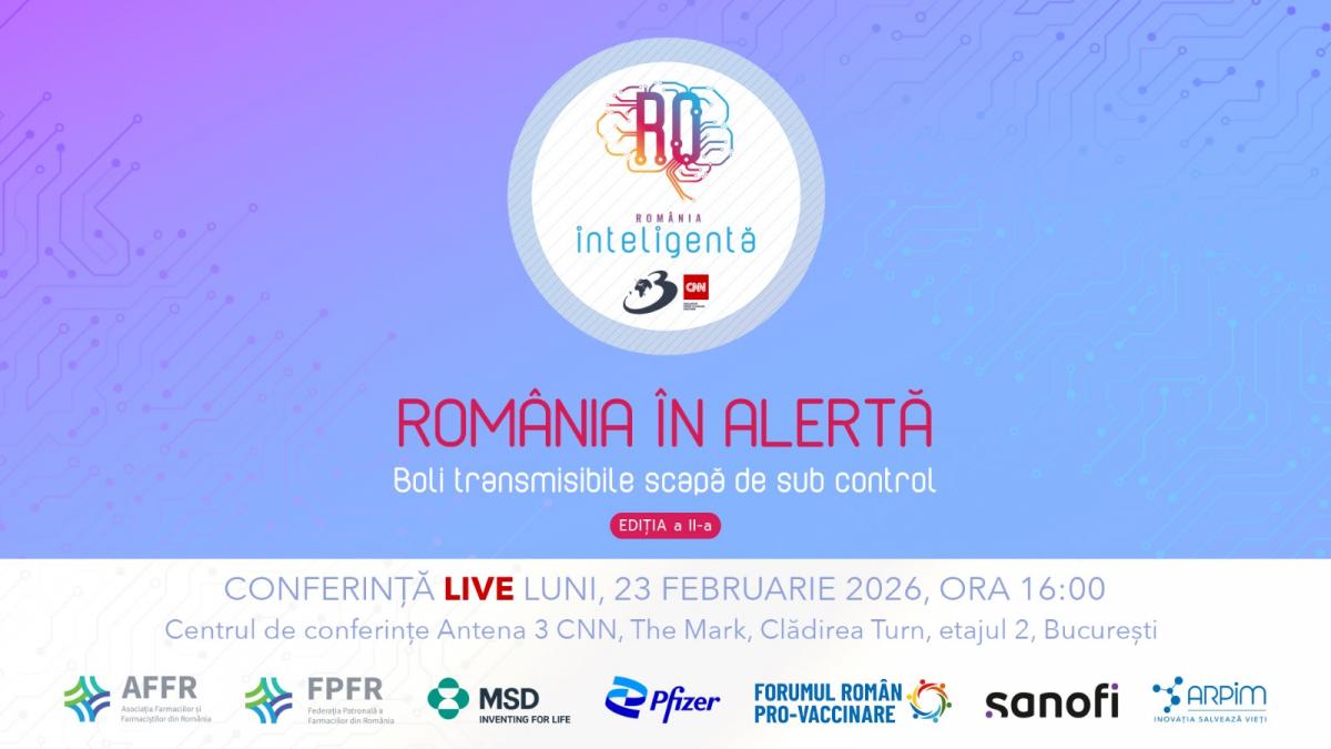 Conferința Națională România Inteligentă ”România în alertă – Boli transmisibile scapă de sub control”, va avea loc luni, 23 februarie 2026, începând cu ora 16:00, la Centrul de Conferințe Antena 3 CNN, “The Mark”, Clădirea Turn, Calea Griviței nr. 84-98, etaj 2, sector 1, București și va fi moderată de Mihaela Tănase, expert în comunicare politici de sănătate, și Adrian Ursu, jurnalist Antena 3.