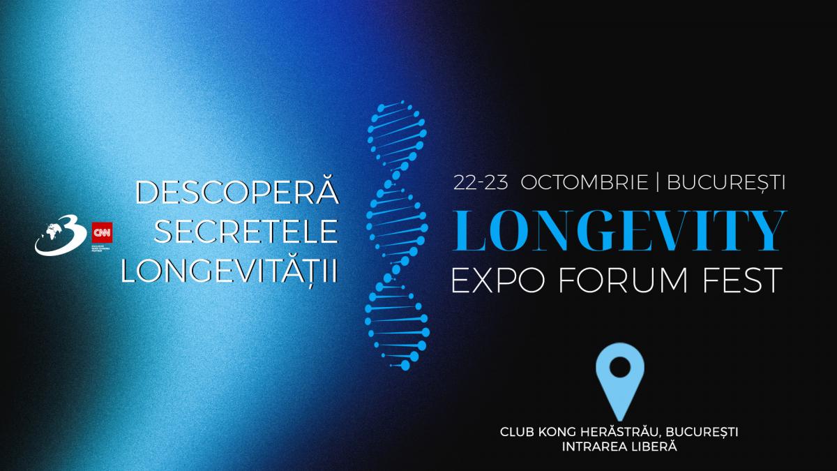 În București, pe 22-23 octombrie are loc Longevity Expo Forum Fest, un eveniment dedicat inovațiilor în domeniul sănătății și longevității care se va desfășura la Club Kong, reunind lideri de opinie, experți și pasionați din domeniul biotehnologiei, nutriției, fitness-ului și sănătății integrative.
