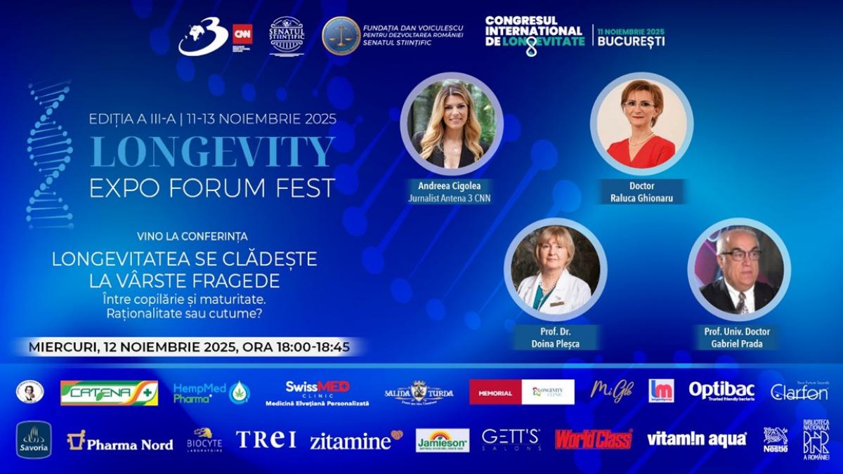 În societatea de azi, speranța de viață crește, dar calitatea acesteia rămâne adesea fragilă. Una dintre cele mai importante întrebări devine: când începe, de fapt, longevitatea? Răspunsul îl oferă specialiștii reuniți în cadrul conferinței „Longevitatea se clădește la vârste fragede. Între copilărie și maturitate. Raționalitate sau cutume?”, parte din Longevity Expo Forum Fest 2025, eveniment organizat între 11 și 13 noiembrie la Biblioteca Națională a României.