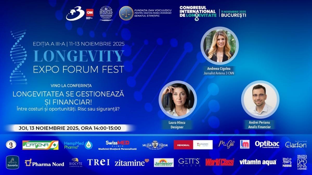 În cadrul celei de-a III-a ediții a Longevity Expo Forum Fest, conferința „LONGEVITATEA SE GESTIONEAZĂ ȘI FINANCIAR!”, programată joi, 13 noiembrie, între 14:00 și 15:00, propune o abordare inovatoare și necesară: cum ne putem asigura că o viață mai lungă rămâne și o viață sustenabilă din punct de vedere financiar.