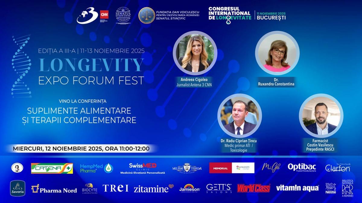 În cadrul ediției din această toamnă de la Longevity Expo Forum Fest, conferința „Suplimente alimentare și terapii complementare” aduce în prim-plan cele mai recente perspective științifice și practice despre prevenție, nutriție personalizată și terapii complementare. Evenimentul reunește specialiști care discută aplicabilitatea concretă a suplimentelor și strategiilor complementare pentru sănătatea și longevitatea participanților.